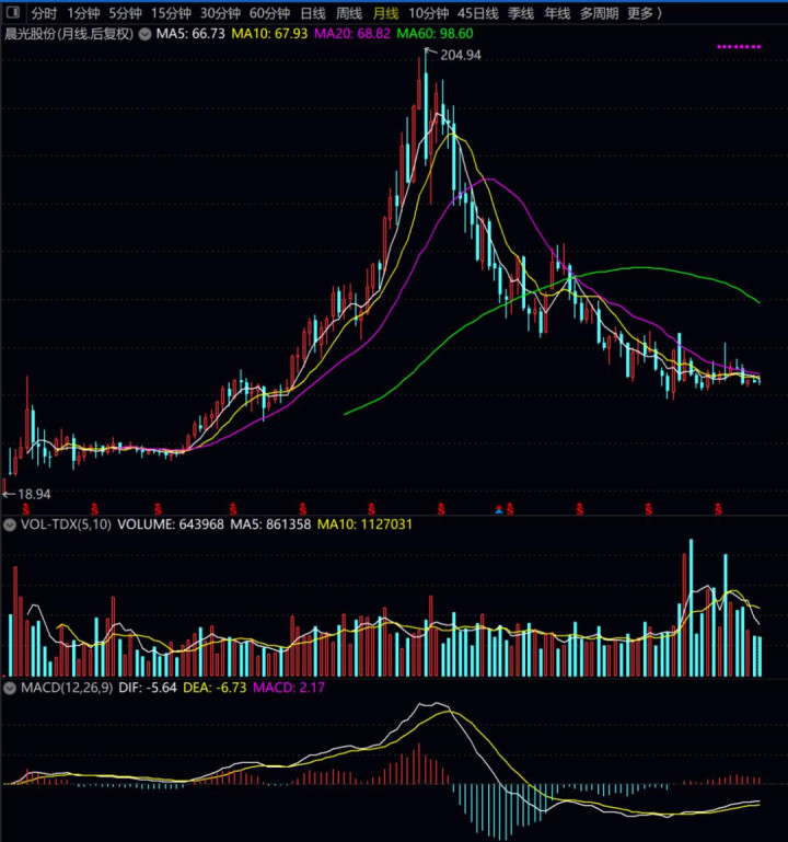 晨光股份于2015年1月份登陆上市,开盘价是18.94(发行价13.15元,新股首日直接高开),到2021年2月,按照后复权股价计算,最高摸到了204.94元,差不多6年时间,妥妥的十倍股。