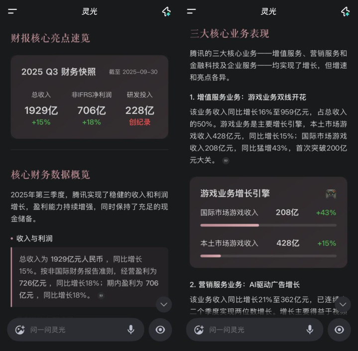 比如我说,详细分析一下腾讯的三季报,它又给出了带有排版和图表的,非常好看的回答。